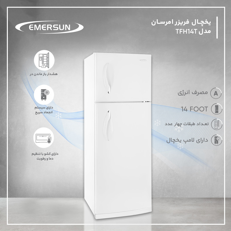 یخچال و فریزر 14 فوت امرسان مدل TFH14T یکی از یخچال و فریزرهای بالا و پایین است که طراحی ساده و زیبایی دارد و برای خانوادههایی با جمعیت متوسط و زوجهایی که نیازی به فضا و امکانات زیاد برای یخچالهای پیشرفته ندارند، مناسب است. گنجایش مفید کل یخچال فریزر 14 فوت امرسان 293 لیتر است که مدلی مناسب برای خانوادههای کم جمیعت است. بهدلیل کیفیت بالا و مصرف برق پایینی که دارد به یکی از پرطرفدارترین یخچال فریزرها جهت استفاده در منازل، ادارهجات و هتلها تبدیل شده و محبوبیت زیادی پیدا کرده است و انتخابی کاملا مناسب و منطقی بهشمار میرود. همچنین یخچال و فریزر امرسان مدل TFH14Tبا داشتن کشویی با تنظیم دما و رطوبت میتواند برای مدت طولانیتری محصولات را درون یخچال تازه نگه دارد و باعث صرفهجویی در هزینه و انرژی جهت جایگزین کردن محصولات فاسد شود. در نتیجه کشوی رطوبتی یکی از باارزشترین قطعاتی است که هنگام خرید یخچال باید به آن توجه داشته باشید. یکی دیگر از مواردی که میتوان به آن اشاره کرد سیستم انجماد سریع فریزر در یخچال 14 فوت امرسان مدل TFH14Tاست که باعث شده این مدل از مدلهای دیگر متمایز شود. همانطور که همه ما میدانیم بهترین روش برای منجمد کردن محصولات غذایی برای اينكه کیفیت خود را از دست ندهند ایناستکه محصولات غذایی در مدت کمتر از دو ساعت، از دمای صفر درجه سانتیگراد به دمای منفی 5 درجه سانتیگراد برسد و در ادامه حداقل تا دمای منفی 18 درجه سانتیگراد، سرد شود كه در يخچال فریزرهایی با سيستم انجماد سريع فریزر Fast Freezing یا Quick Freezing اين امكان فراهم است.